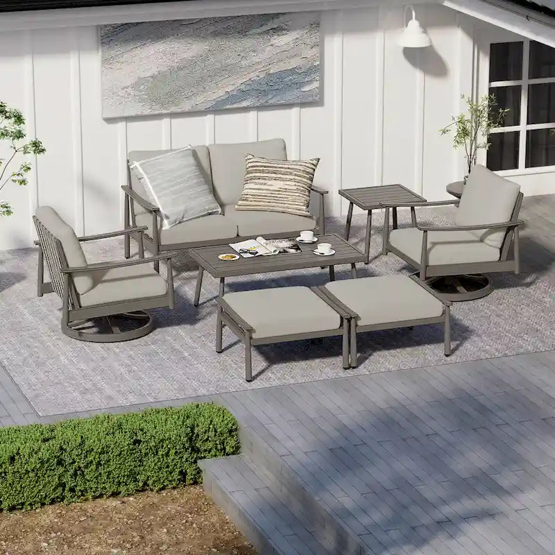 7-Piece Aluminum Patio Conversation Set, Loveseat with Ottomans, 2 Swivel Armchairs and Coffee Table