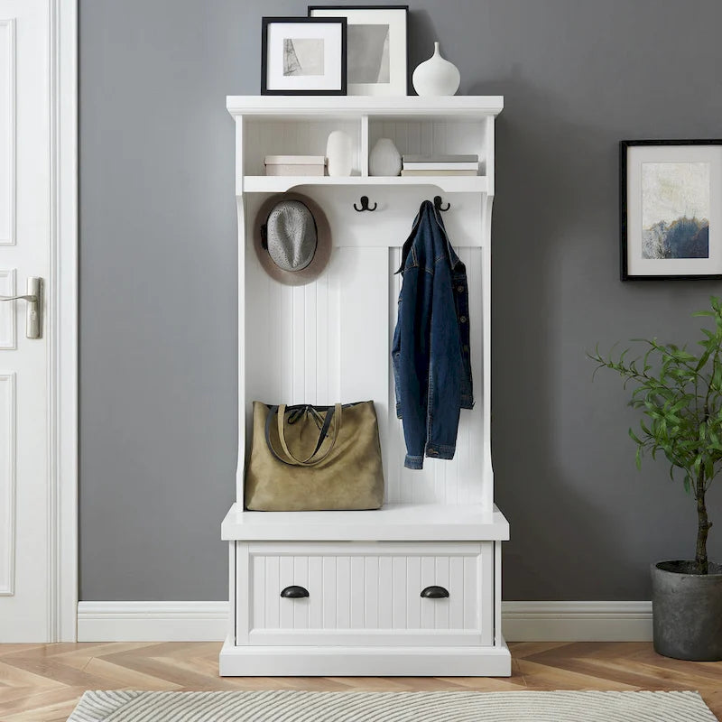 Bring a touch of coastal charm to your home's entrance with the Shoreline Hall Tree. With classic beadboard paneling and genuine metal hardware in a bronze finish, this hall tree boasts a coastal cottage design that pairs well with traditional and farmhouse decor styles. Perfectly sized for smaller entryways, it offers bench seating with a large drawer to store your shoes, while the three double prong hooks provide ample hanging storage for coats and book bags. Organize your essentials on the two open shelves at the top, and enjoy a clutter-free entrance with the Shoreline Hall Tree.