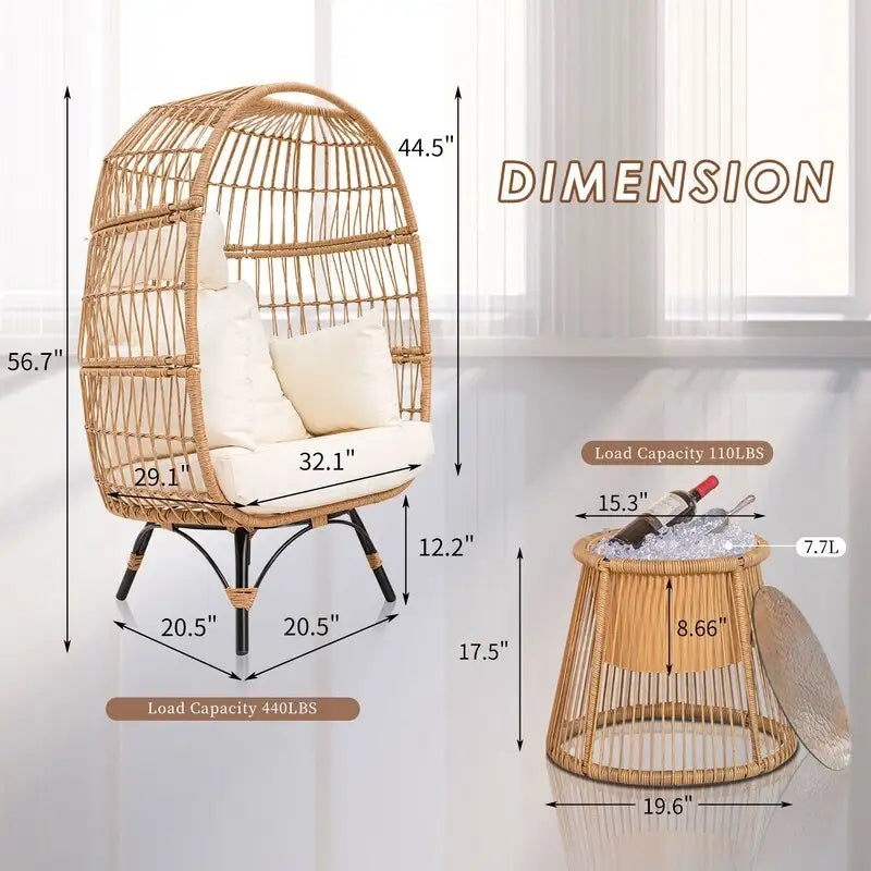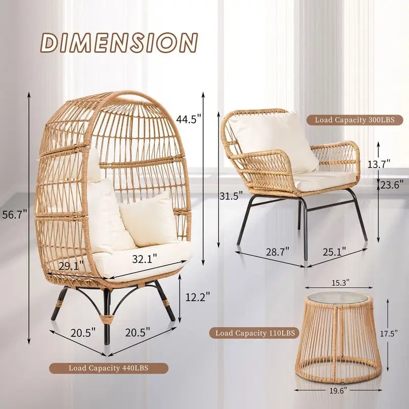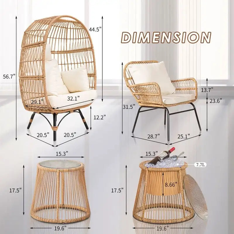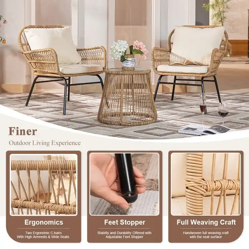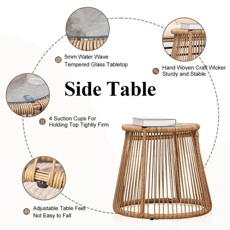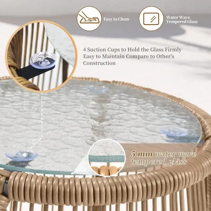 We use premium handwoven PE wicker for this BOHO patio furniture set. The wicker is sturdy and not easy to break which guarantee this boho outdoor seat will last longer. Constructed from polyethylene rattan resin wicker wrapped around a steel frame for weather protection, strength and durability. The glass top of the side table is made of 5 mm water ripple tempered glass, making it safer and stronger. Easy to clean with a cloth.