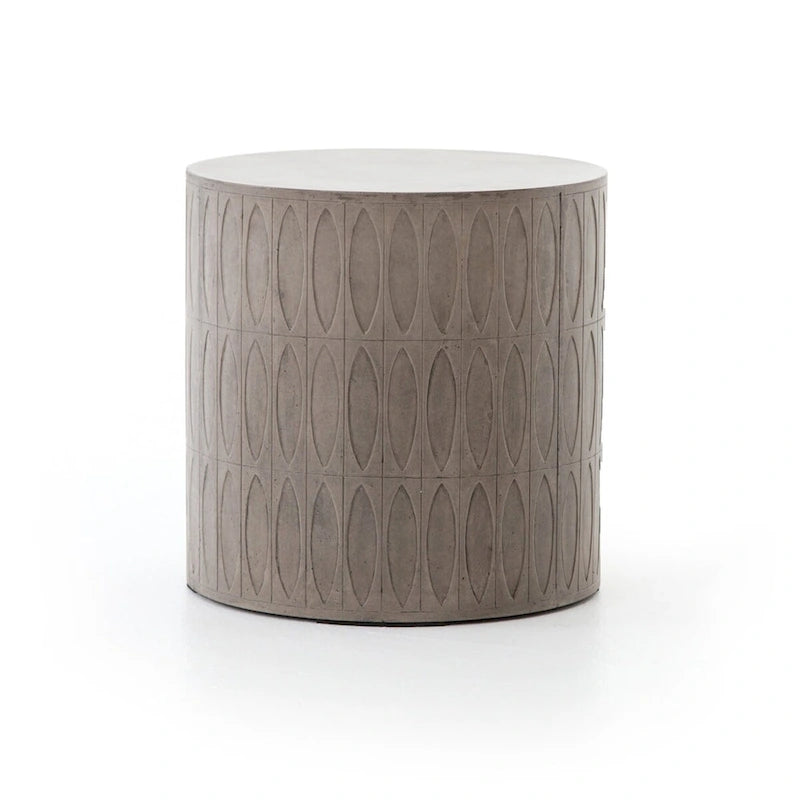 Concrete adopts alluring shapes as modern geometrics play with nature's petal form. A hollowed drum of dark grey concrete is intricately etched for artistic intrigue. Safe indoors or out. Cover or store indoors during inclement weather or when not in use.