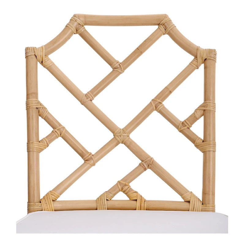 A rattan chair reproduction from the original master cabinet maker, the Kara collection is a Chinese Chippendale style design inspired by pagoda motifs with visually appealing diagonal lines. Complete with interlocking geometric lines in shield back design, an elegant addition to a coastal or classic style interior decor. Fully assembled, available in Natural, Paloma Brown, White, and Gray. Set of 2.