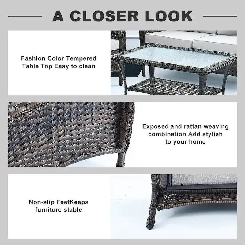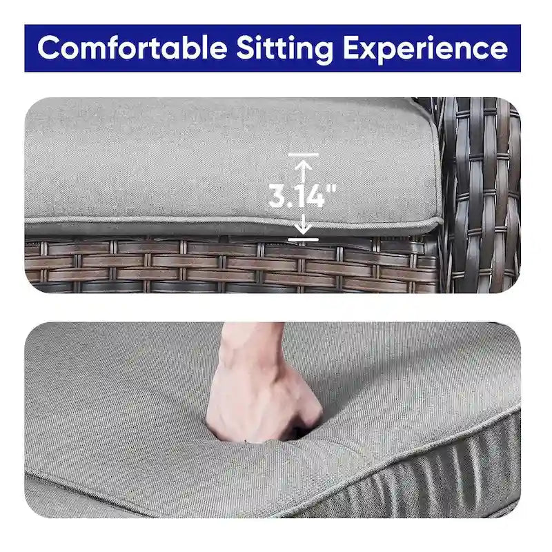 - All-weather PE Wicker Furniture: Featuring a long-lasting woven finish, this style is not only incredibly durable but also provides a versatile appearance. The handcrafted details of this material allow this patio furniture set to blend seamlessly with your outdoor decor.