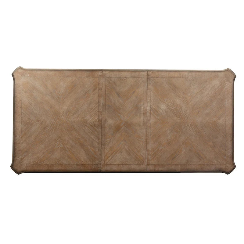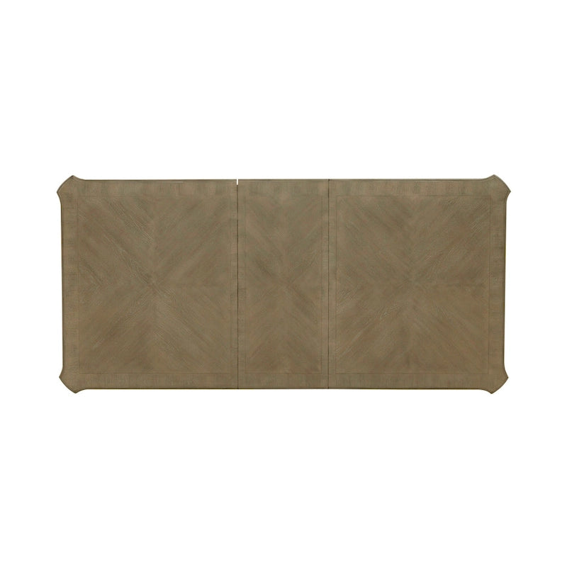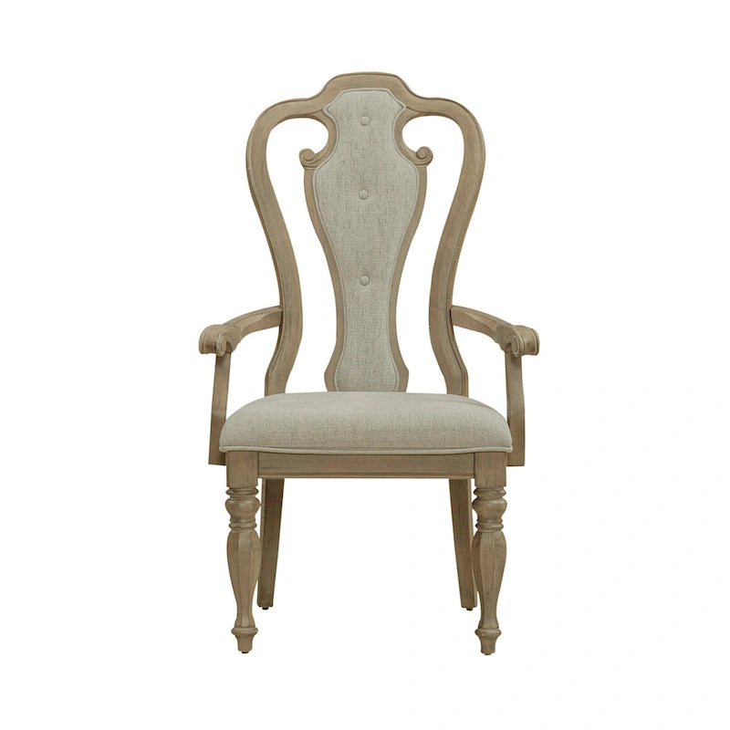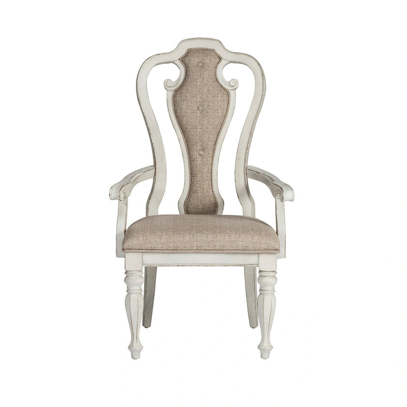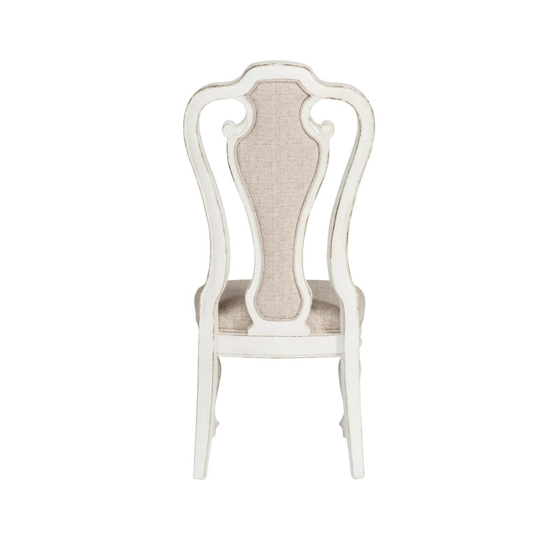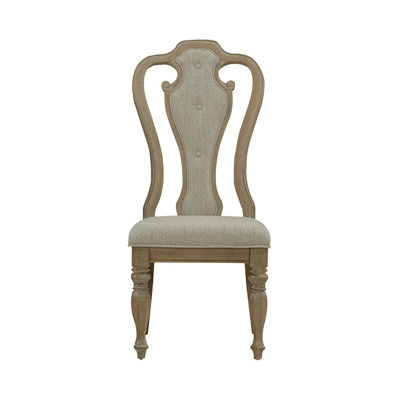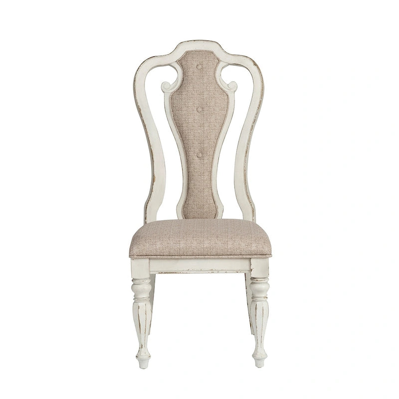 Make entertaining easy and stylish with the Magnolia Manor 7-piece rectangular table set. Crafted with excellence using Poplar solids and White Oak veneers, this set features an Antique White finish with heavy distressing or a stained Weathered Bisque finish and includes four splat back side chairs and the rectangular leg table. The table includes an 18 inch removable leaf on a wood guide and double metal gear leaf track system. The tabletop features a fancy face veneer pattern with canted corners, supported by faceted turned legs. The chairs feature the perfect blend of European design with upholstery in ivory chenille or taupe tweed, dog bone accents on the splat back, tufted back panel, nylon chair glides to protect your flooring, and beautifully faceted turned legs. European influences in the Magnolia Manor seven piece rectangular table set makes for a truly unique style for any living space.