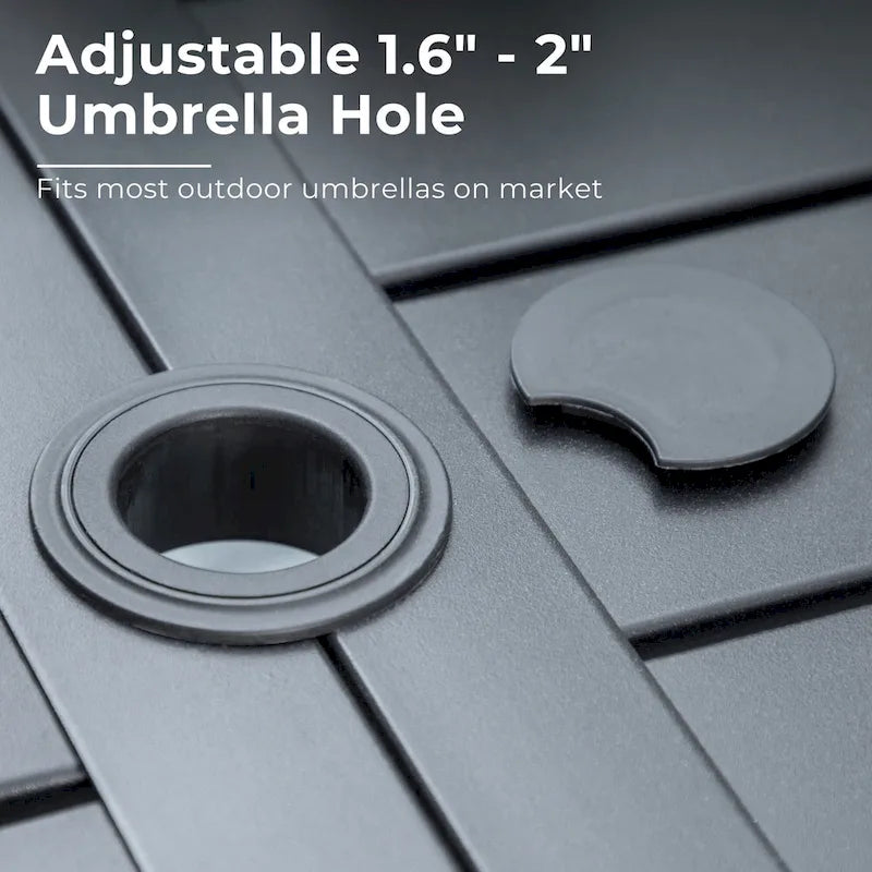 The umbrella base is not included. For your own safety and to avoid unnecessary damage, please keep the umbrella closed and secured when it's under strong wind or not in use.