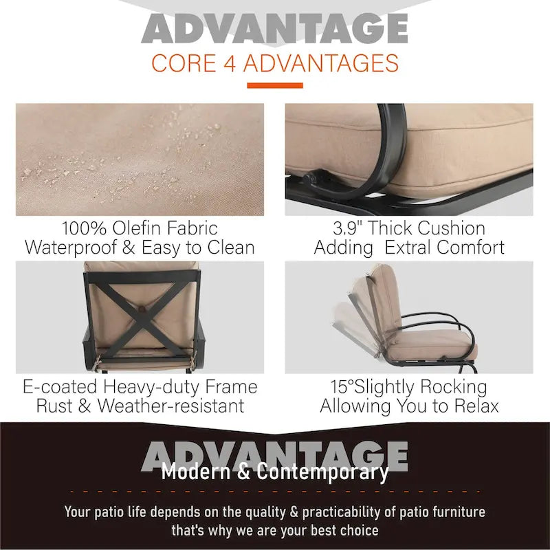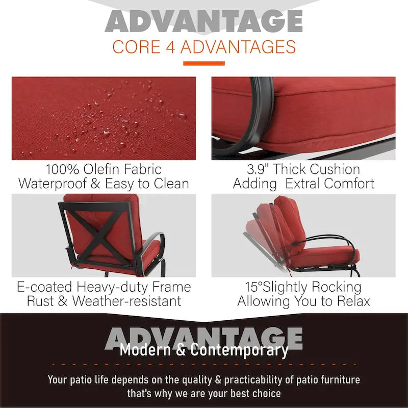 The 7-piece dining set is made of high-quality steel, with coating, and high rust resistance. Can be used outdoors or indoors. Modern X shape design with widened upper and lower frames ensures enough comfort. The C-Spring motion chairs allow you to gently rock for true comfort. Cushions are made with water-resistant, fade, and stain-resistant cover, allowing easy cleaning of accidental spills or blemishes caused by the elements. And the table is made of premium metal in professional powder coating processing with a beautiful steel slat table top. The feet are equipped with anti-skid pads to prevent scratching your floor.