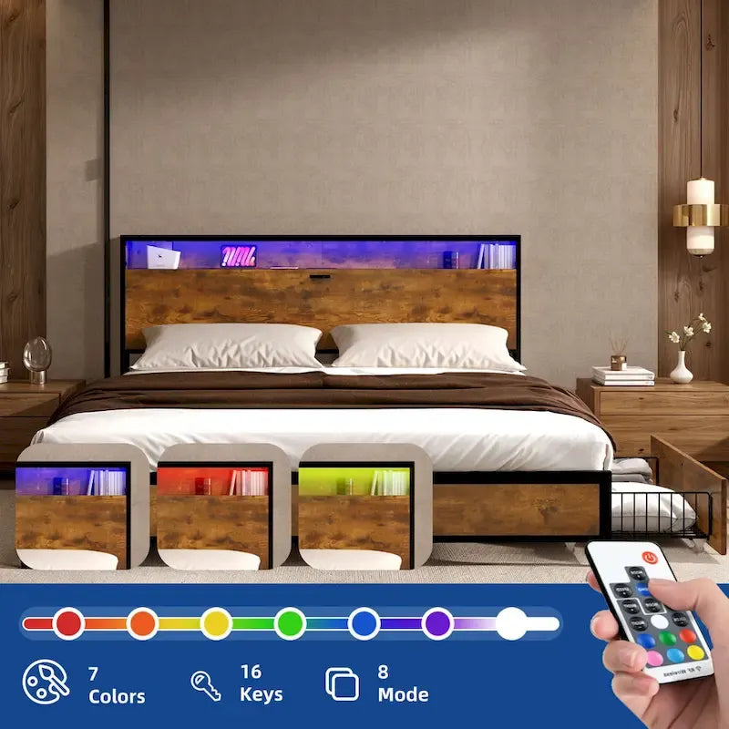 - Headboard features LED strip light with multiple dynamic modes and brightness