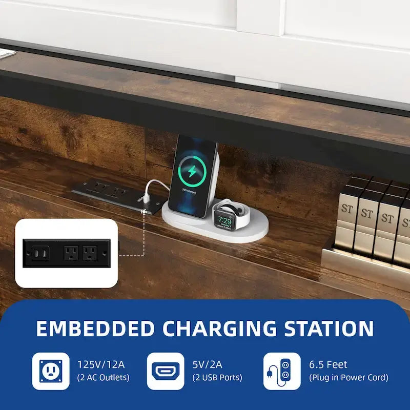 - King bed with charging station features a pull-out headboard and convenient hidden storage
