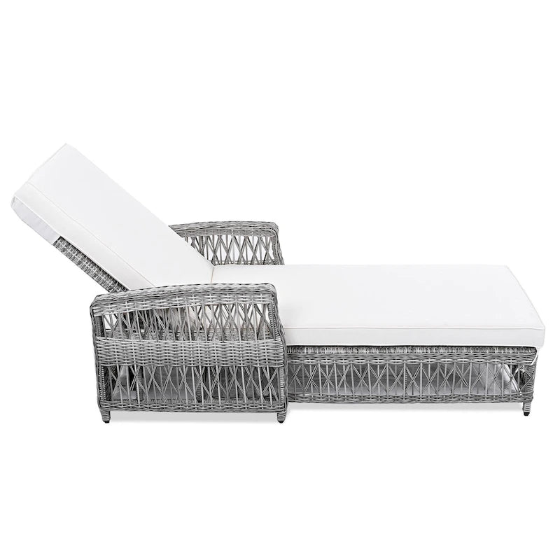 Enhance your outdoor space with this long reclining wicker chaise lounge, designed for both style and comfort. Featuring an adjustable 4-level backrest, ergonomic armrests, and thick removable cushions, it’s perfect for relaxing poolside, on patios, or in gardens. Durable PE rattan paired with a sturdy iron frame ensures lasting use in any season. With a sleek woven design and neutral gray tones, this all-weather chaise complements a variety of outdoor decors while offering superior lounging comfort.