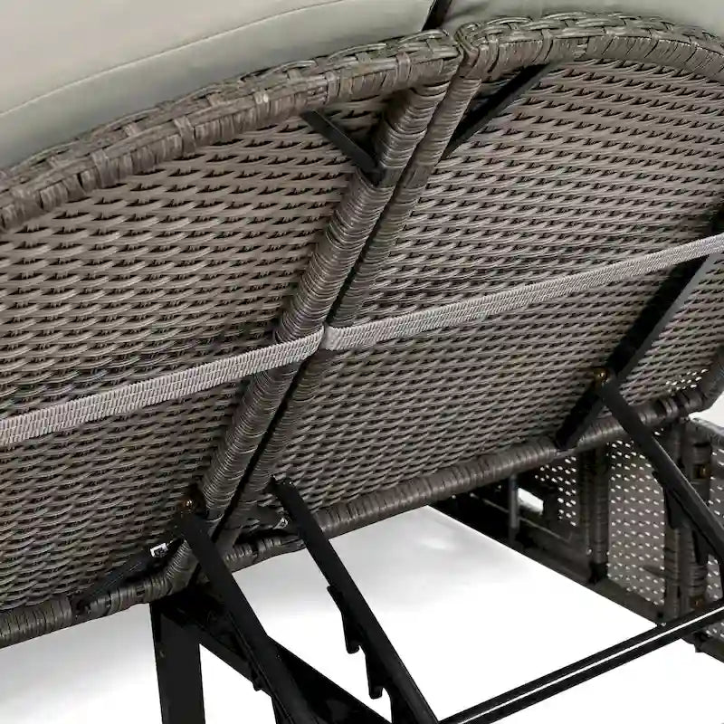 - This premium outdoor sun bed combines thoughtful design with high-quality materials, offering a versatile lounging solution for your patio or garden. The adjustable reclining mechanism allows you to select the perfect height for ultimate relaxation, while the foldable cup trays on both sides provide convenient spots for drinks and personal items. With 3.9-inch thick cushions that stay securely in place, this daybed ensures comfort throughout your outdoor lounging experience. Easy-to-clean, water-resistant cushion covers make upkeep effortless, giving you a durable and practical addition to your outdoor furniture collection.