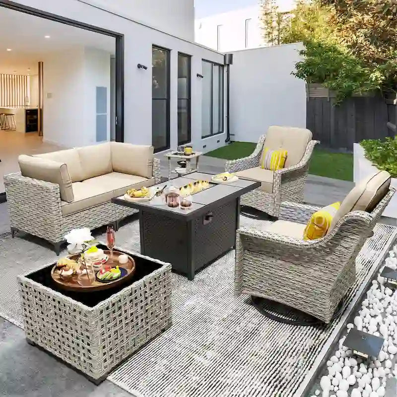 OVIOS 7 Pieces Outdoor Wicker Furniture Set With Solar-Powered Coffee Table&Fire Pit