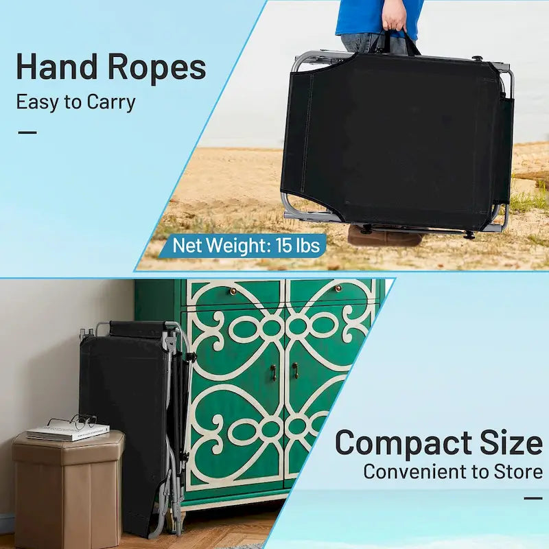 5 Adjustable Backrest: Featuring 5 different backrest positions, this outdoor chaise lounge chair meets your various sitting posture needs, such as sitting up, reclining and laying down so that you are able to find a suitable sitting position for maximum comfort and relaxation. Rotatable Canopy Shade: Different from other common recliners, this high quality reclining chair comes with 360 degrees rotatable canopy shade which allows you to adjust it into any desired angle according to the changing position of the sun. In addition, you can put the sunglasses and drinks into the side storage pocket. Sturdy Construction: Made of durable oxford fabric, this adjustable patio lounge chair is breathable for a comfortable lying experience. Meanwhile, the heavy duty steel frame with anti-rust surface holds up to 330 lbs. Therefore, this outdoor recliner will evenly distribute your weight. Foldable & Portable Design: Thanks to its foldable and lightweight design, this premium sunbathing chair is suitable for different places, such as poolside, beach, patio and garden, etc. Meanwhile, the hand ropes can help to carry it more conveniently. And it can be stored easily for saving your space. Easy Installation: Most of this outdoor chaise lounge has been installed. All you need to do is assembling the canopy shade for great convenience. And the detailed instruction will help you.