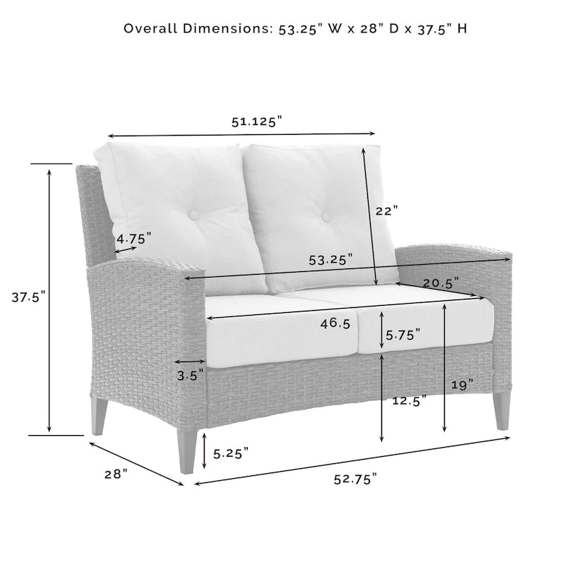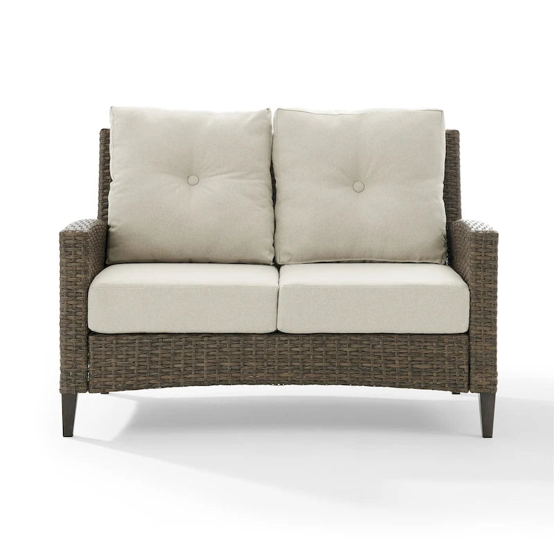 Elevate your outdoor get-togethers with the Rockport Outdoor Wicker High Back Loveseat. Crafted from all-weather resin wicker over a powder-coated steel frame, this loveseat is designed with a high back, gently arched arms and quick-drying olefin fabric cushion covers for lasting comfort. The unique steel tapered legs are painted with a faux wood finish to add a touch of rustic charm.