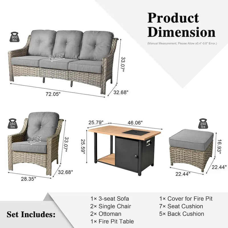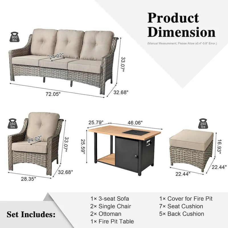 - Comes with 1 3-seat sofa, 2 single sofas,2 ottomans and a double-layer fire pit table